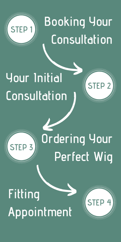 STEP 4 Fitting appointment. This is when you will get to see and try the wigs specifically chosen for you. It is usually in this first fitting appointment that a suitable wig is found, and if necessary personalised to suit you i.e. with fringe cut or fullness reduced. All aspects of aftercare are also explained to help you keep your new hair looking good.